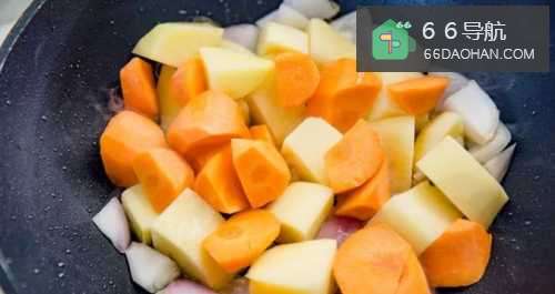 22、炒配料热锅倒油,倒入前面切好的土豆、胡萝卜、洋葱,用中火翻炒。