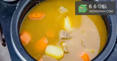 88、炖牛腩牛腩连汤倒入电饭煲中,开启煲汤功能。