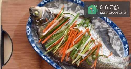 8将蒸鱼的汤汁倒弃,在鱼身上铺上葱丝和椒段。