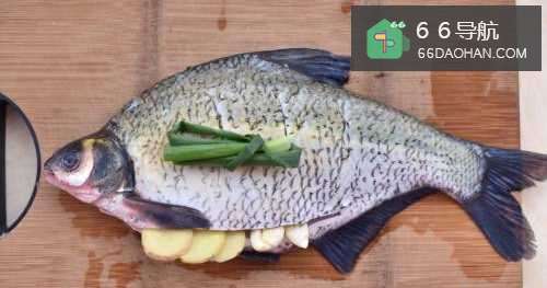 4鱼身内外抹上薄薄的一层细盐,把姜、蒜、葱结塞入鱼腹中。