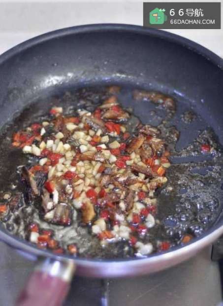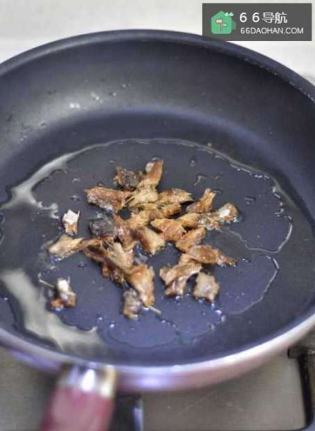 7锅里倒适量油,油热后倒入鱼干煸炒片刻