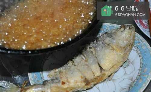 5再将糖醋酱汁淋入炸好的黄鱼身。