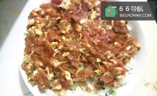 6最后加入适量的盐和味精调味好,就可以将西红柿炒蛋连同汁液浇淋到饭上面。