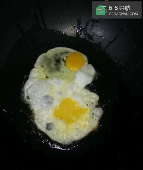 3取两个鸡蛋,开火,加入食用油,再将鸡蛋打入锅里,待鸡蛋结块,打散;