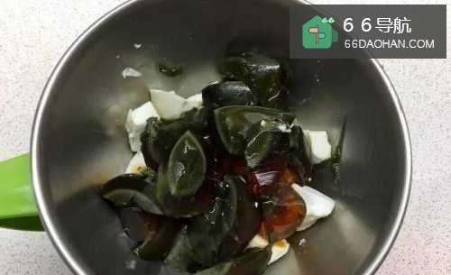 4锅热加少许油后爆香蒜,再入咸蛋、皮蛋炒至表面略焦化感
