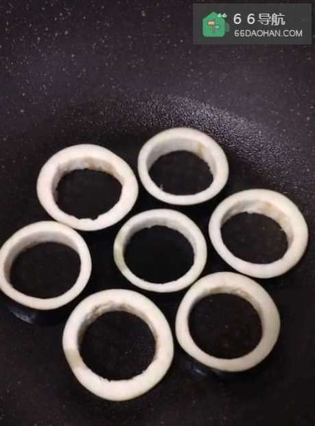 5锅内刷油,将之前做好的茄子环放入锅中,调制好的面糊直接倒入茄子环中,小火煎至一面金黄定型,反面继续煎熟,就可以出锅了,配合蘸料食用更加美味。
