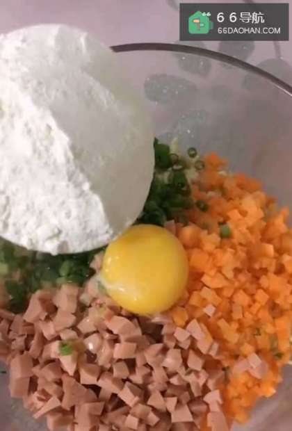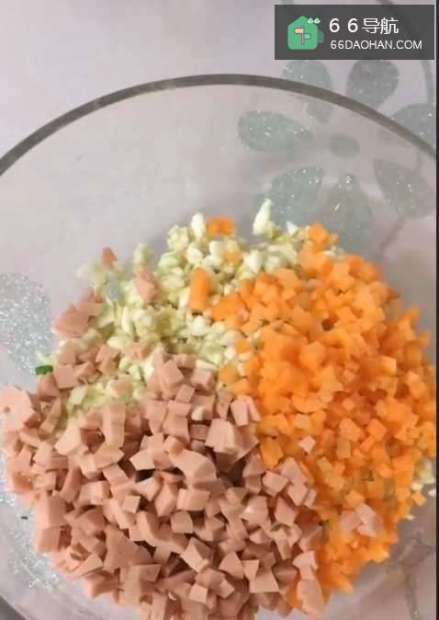 3取来一个大碗,讲切好茄子肉、胡萝卜、火腿肠都放到碗中,放入大量的葱花,加入适量的盐、鸡精、蚝油搅拌均匀。