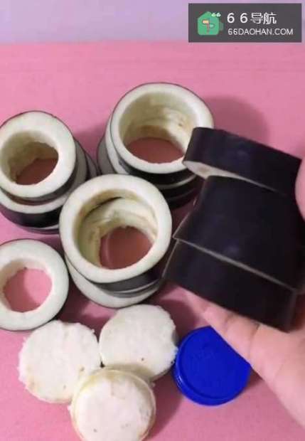 2用一个合适大小的瓶盖讲茄子肉挖出来,外皮保留形成一个环状,取出来的茄子肉切成碎丁备用