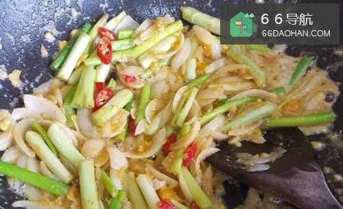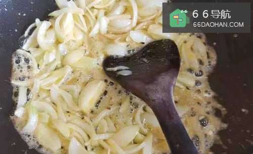 3原锅再放入洋葱丝稍微炒软, 再何扯倒入葱段略炒