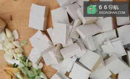 将买来的豆腐块用水冲一下,然后切成小方块约2*2*0.6厘米;将葱、蒜剥好,冲洗干净,将葱切成小斜段,将蒜切成蒜片,将姜洗干净切成粗姜丝。
