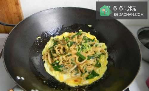 14鸡蛋液上面还没有凝固时,将炒好的饼丝放在没有凝固的蛋液上,让蛋液和饼丝粘在一起