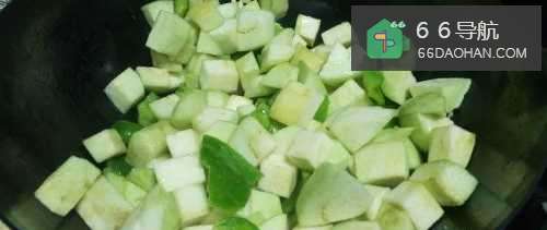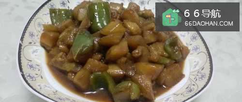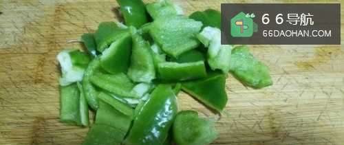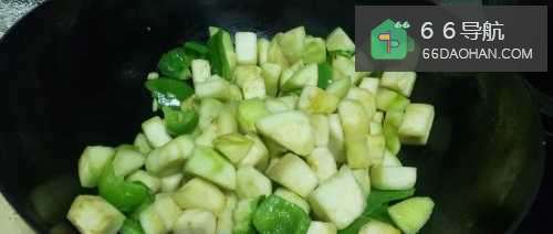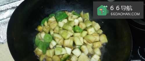 茄子去皮切小块,青椒去蒂后掰成小块。