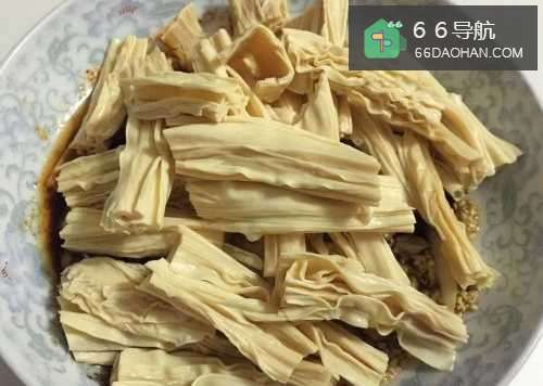 6将腐竹挤干净水分后放入酱汁中,搅拌均匀后冷藏10分钟即可食用了。
