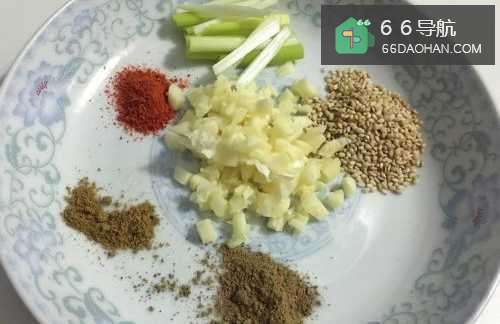 2将蒜末、辣椒面、花椒面、孜然粉、白芝麻和葱丝全部放入盘中。