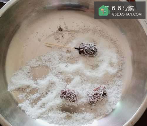 44、然后准备一个浅盘,放入椰蓉,然后将沾了巧克力的棉花糖放入盘中,左右摇晃,直至沾满椰蓉。
