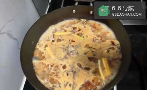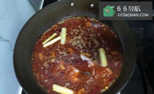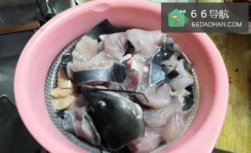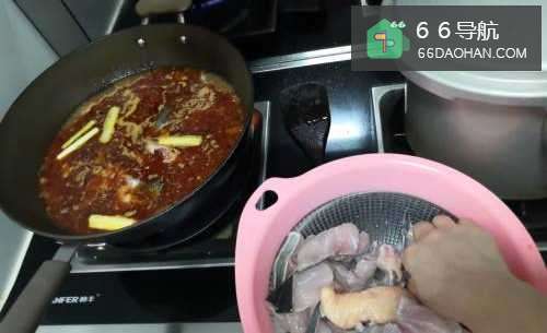 7往锅中慢慢放入鱼,先放鱼骨部分。