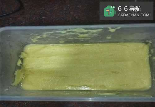 6炒后的豌豆泥用保鲜盒直接装起来,再放到冰箱放入冰箱冷藏4个小时,直到完全凝固定型成块即可。