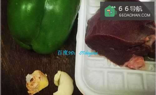 准备主要的食材一个青椒、一块新鲜的猪肝、少许生姜、蒜头。