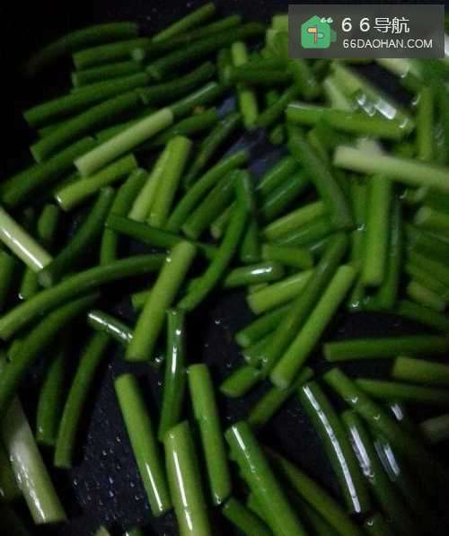 3锅烧热,放入适量油,将切好的蒜薹放入锅中翻炒
