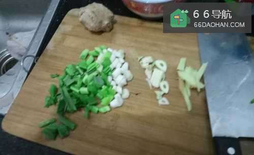 3生姜洗干净切片,蒜头洗干净切小片,蒜叶洗干净切小段。