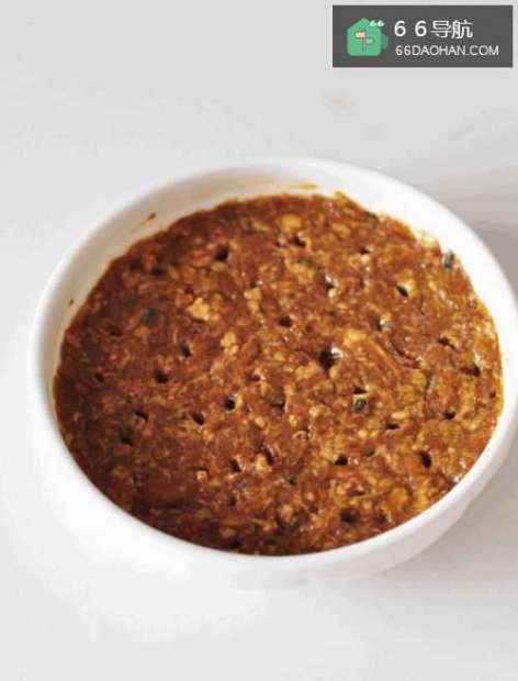 2饺子馅平铺在盘子里,用筷子戳均匀的洞。