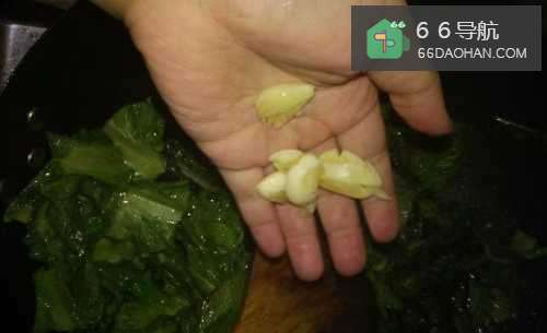 5待莴苣叶入锅翻炒两三下后,就可以将蒜头下入锅里,一起翻炒了;