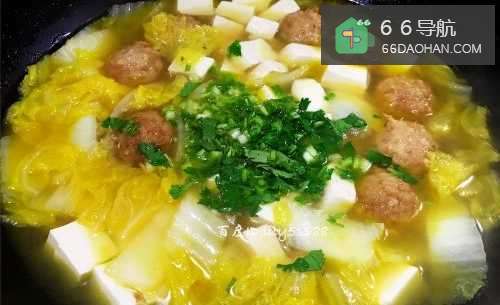 6白菜丸子豆腐都煮熟后,放入生抽、蚝油、盐、香菜、葱,用一点点水淀粉勾芡让汤水变得更加浓稠一些。