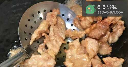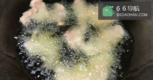 5锅倒入油油温至六七分的时候,摊开肉片放入慢慢炸熟。