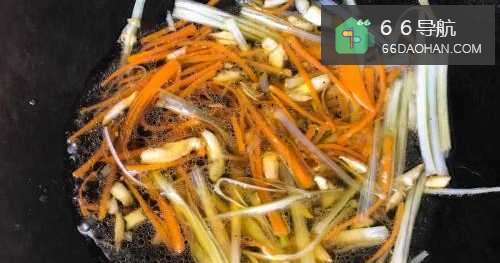 7倒出油后锅中留下少许油,爆香蒜碎放入红萝卜丝及大葱丝。