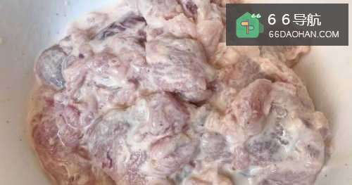 4肉腌制完成后打入一个蛋清,搅拌均匀后加入面粉、玉米淀粉及少许的熟油和水,再次抓捏均匀备用。