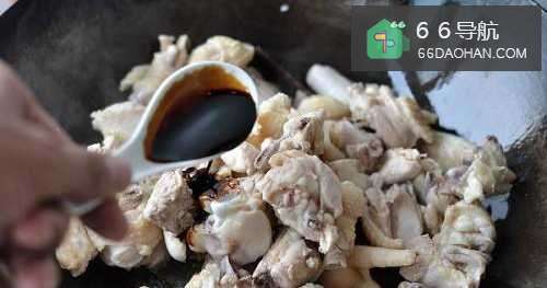 4倒入焯过水的鸡块,倒入一汤匙老抽翻炒