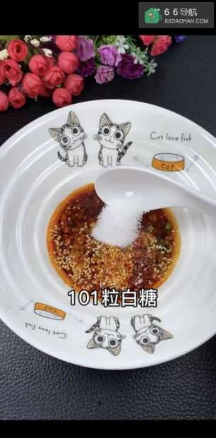 2再放4勺陈醋、100粒盐、101粒白糖,搅拌均匀