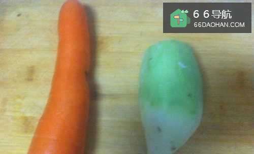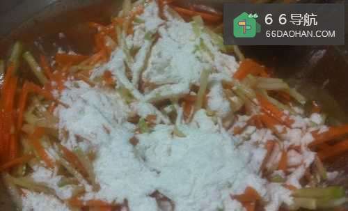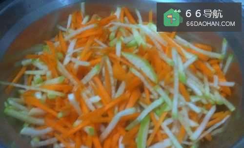 2白萝卜和胡萝卜分别切成细丝,放入盆中,用手搅拌,使两种萝卜混合均匀。