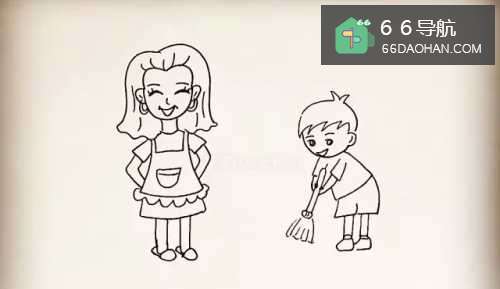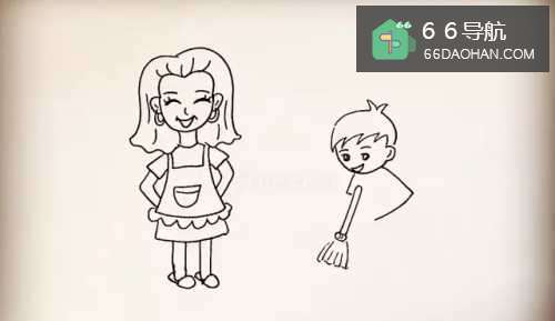 6在画出小男孩的表情.他在干什么呢?画出他的身体.还有一个扫把.这里要仔细观察。