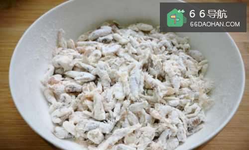 4腌制好的河虾,挑拣出姜丝,倒掉腌制出的水分,然后加入3小勺勺淀粉,5小勺面粉。