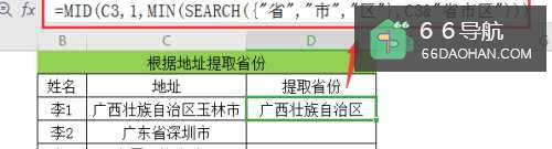 点击D3单元格,输入=MID(C3,1,MIN(SEARCH({"省","市","区"},C3&"省市区"))),按回车键结束