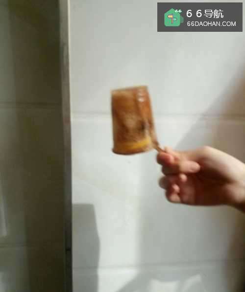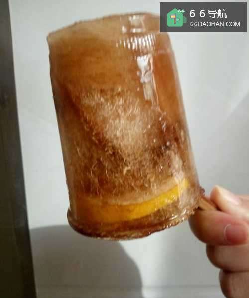 7冰好之后拿出来,冰棍就做好了,如果塑料杯和冰棍粘在一起,拿不下来,用温水浇一浇就可以轻松拿出来了。