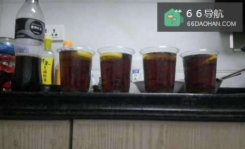 4然后加上水(不要加满,因为等一下还要加鸡尾酒和柠檬,水冰成冰体积也会变大,加太多会溢出来),再加入一点鸡尾酒,再在每杯可乐里加入半片柠檬(也根据个人口味来加,不喜欢也可以不加,柠檬也可以挤成汁加入可乐里)。
