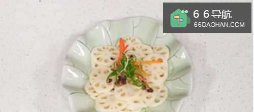 10 取一个盘子,放入焯熟的藕片,再浇上味汁即可。