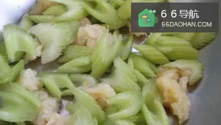 6最后将料酒放入锅中再放入适量的盐翻炒几下一盘美味的鱼鳔炒西芹就出锅了。