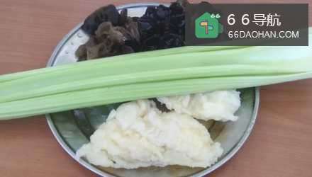 将西芹清洗干净并切成段、木耳用温水泡发捞出备用、准备好鱼鳔。