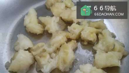 3开火将油加入锅中待油温升高将切好的鱼鳔放入锅中煎炸。
