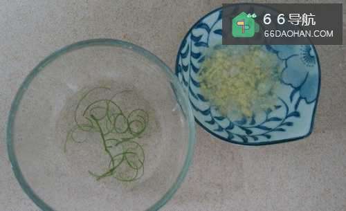 2姜、蒜拍碎,淋入白醋,葱撕成细丝泡在水里(变卷)。
