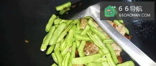 5下入四季豆翻炒片刻,倒入淘洗好的大米。