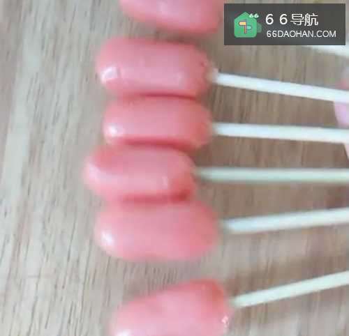 4将面团擀成小片,烤肠用竹签穿起来,用面片包起来。