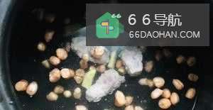 6把排骨和花生倒入砂锅,加入适量水,盖上锅盖,大火烧开后,加入海带转中火炖煮大概一个小时