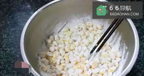 4调入盐、鸡粉,充分搅拌均匀,让每一粒玉米都裹上淀粉,这样吃起来才会酥脆;