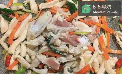 4将鸡胸肉翻炒至表面翻白,加入1小匙盐翻炒均匀将鸡胸肉炒熟。