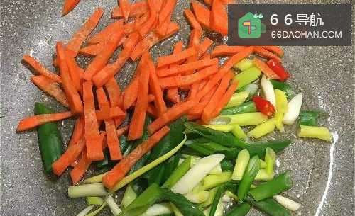 2锅里放油炒香葱段、辣椒、红萝卜。