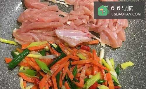 将鸡胸肉和红萝卜切丝,金针菇、葱和辣椒切段。
